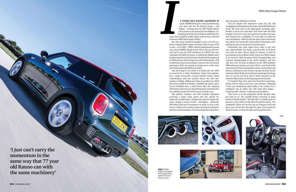 Back behind the wheel. I ask my Mr Monte Carlo winner for some more pointers. Smoothness through the tighter turns is the key, he says, since jumping on the power too early will unsettle the front end as 231bhp is launched in one big lump towards the front axle, ultimately leading to a slower laptime. And if, he continues, I find I need more than a 180-degree lock on the steering wheel, I’m either over-driving or have got my corner entry VERY wrong (a mark which, fortunately, I don’t overstep). With that, Rauno points at the traction control switch – or the ‘fun button’ as he terms it – tells me to turn everything off, and jumps into the JCW that will lead me at speed around the Mallorca circuit once again.